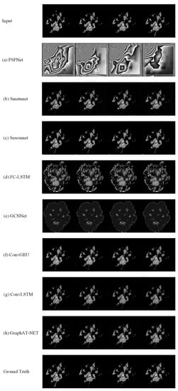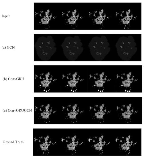 To validate the effectiveness of the GCN module, we conducted experiments among GCNNet, ConvGRU, ConvGRU + GCNNet, and GraphAT-Net. The purpose of this experiment is to evaluate the contribution of the GCN module to the performance of GraphAT-Net. As shown in Table 3, ConvGRU with GCN increased about 10.9% on MSE and showed the same performance on SSIM. This indicates that GCNNet could enhance the model to learn more accurate features. Specifically, the GCN module can capture the spatial dependencies among the input data and propagate the information to the subsequent layers, which leads to more accurate predictions. To better illustrate the enhancement, we present visual results in Figure 10. As shown in Figure 10, the results of pure GCN are still unreadable, while ConvGRU + GCN performs much better than ConvGRU. This verifies the effectiveness of GCN as an embedded module in the CNN+RNN-based framework. Specifically, the GCN module can effectively capture the spatial correlations in the input data and enhance the feature representation of the model, which leads to more accurate predictions. The experimental results demonstrate that the GCN module can effectively enhance the feature representation of the model and improve the accuracy of the predictions. Therefore, the GCN module is a valuable addition to the proposed method and can be used to improve the performance of other CNN + RNN-based models.