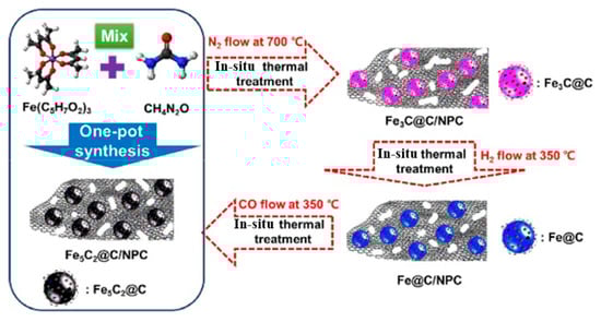 Synthetic scheme of carbon encapsulated iron-based nanoparticles supported on nitrogen-doped porous carbon nanostructures []. Copyright (2019) Nano Research.