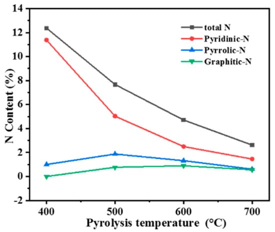 The treatment temperature is considered as a major factor influencing the nitrogen content of nitrogen-doped carbon materials. For example, when treating graphene oxide and activated carbon in an NH3 atmosphere between 500 and 600 °C, the nitrogen content is highest, and is more than twice the nitrogen content of samples calcined at temperatures above 800 °C [,]. Wang et al. also found that as the pyrolysis temperature increased from 500 °C to 800 °C [], the nitrogen content remarkably decreased from 19.8 to 2.08%. It can be seen that the pyrolysis temperature in an ammonia atmosphere has a significant impact on the nitrogen content of the material. In addition to the nitrogen content, the treatment temperature also has a considerable influence on the types of nitrogen species. Wang’s research revealed that as the treatment temperature increased, the unstable structure of pyrrolic nitrogen resulted in a reduction in its content, and there was also a decreasing trend in the content of pyridinic nitrogen.