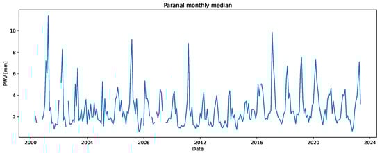 The monthly median values of precipitable water vapour (PWV) for the Paranal Observatory are shown in Figure 1 and no augmentation in minimum PWV with time is discernible; however, a marginal decadal oscillation can be inferred. If anything, what is clearly visible is the variability in the maximum PWV events during the austral summers. This variability is most likely influenced by the predominant position of the Bolivian high-pressure centre during summer months [,,], which leads to dry anomalies during the normally wet summer for the combination of EN/PDO(+) []. The PWV long-term record for the Chajnantor site was analysed in [], and no evidence of PWV trends over the 20 years of data was found, in agreement with our results for the Paranal Observatory.