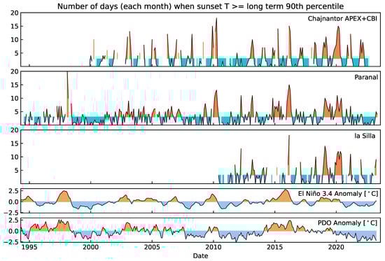 Days in a month with the ambient temperature at 2 m above surface above the long-term 90th percentile for all sites studied. Values below the thresholds are shaded in blue, and values above the threshold are shaded in red. The lowest two panels show the Niño3.4 index and the PDO (Pacific Decadal Oscillation) index.