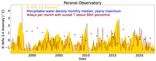In this work, we aim to fill this knowledge gap for the astronomy community by assessing the suitability of ENSO as a predictive tool for interannual condition changes. The prominent feature of the El Niño (EN) phase of ENSO is the warming of the tropical Pacific, quantified by the Niño3.4 index, leading to increased near-surface air temperatures down to 30 S—encompassing all observatories in this study along the Pacific coast of South America. Its counterpart, La Niña (LN), is marked by opposite conditions. While EN phases have been correlated with higher precipitation in the 30–41 S latitudes band [], the subtropical region, where the Atacama Desert lies, has been correlated with dryer conditions [].