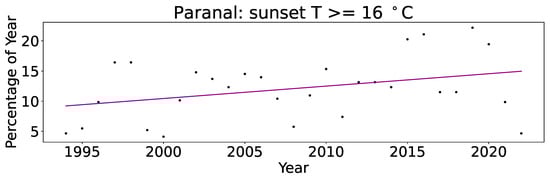 The fraction of the year where the sunset air temperature at 2 m is above 16 C as black dots, expanding Figure 1c from [], which spanned the years 2008–2020. The magenta line marks a linear fit to the data to indicate the long-term trend.
