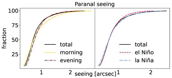 The period after 2020 was associated with LN conditions, and our results, as shown in Appendix B, indicate a higher seeing variability during LN periods. As we are entering (2023) into the next EN period, the future record of seeing will show if the lowest seeing conditions decrease compared to the 2016–2020 period characterised by mainly neutral ENSO conditions. Nonetheless, it is important to state that the seeing conditions in the Paranal and Cerro Armazones region (ELT site) remain exceptional for seeing-limited astronomical observations and, at large, are unaffected by ENSO and climate change, confirming the results from a decade prior [].