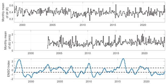 Furthermore, and motivated by the work of [], we analysed the near surface level temperature record to check for possible trends in temperature gradients between the 30 m and 2 m height from the ground level. Similarly, we also analysed the vertical gradient in the horizontal wind speed from wind measurements performed at 30 m and 10 m above ground level. The long-term record for the monthly means of the vertical differences in temperature and horizontal wind speed are shown in Figure 6. Our results show seasonal variability, but, overall, the temperature and horizontal wind speed gradient have remained stable, within their natural variability. For completeness, the gradients are shown together with the ENSO index. This result on the wind speed and temperature gradient expands the exhaustive work on the relation of seeing and wind speed and temperature gradients in the context of climate change from 2009 at the Paranal Observatory []. In that work, the authors analysed the data from 1990 to 1998 and from 1998 to 2008 and concluded that climate change had no significant impact on seeing in this time period. Additionally, and most importantly, they concluded that the Armazones site, now host of the ELT construction, was unaffected both by seeing changes due to climate change or due to EN or LN phases. We expand their findings with complementary data from the decade following their study.