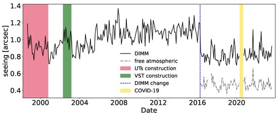 As well as the integrated (whole-atmosphere) seeing in Figure 7, we have included the free-atmosphere seeing from 2016 onwards, which does not show any particular trend either. Free-atmosphere seeing results from optical turbulence from 250 m onwards, away from the surface layer, up to the top of the troposphere. The MASS instrument allows measuring the free-atmosphere seeing [], as well as other parameters important for observational astronomy.