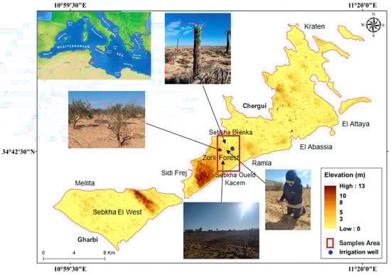 The research area, where samples were collected, as shown in Figure 2, encompasses a diverse range of land types which allowed us to examine variations in soil salinity across different land uses and salinity levels. In fact, it comprises a big part of the renowned “Zorii Forest,” as well as segments of the irrigated parcels of Ramla (irrigated with underground water from the well with salinity level of approximately 3.6 g/L, shown in Figure 1) and parts of the Brenka sebkha and the Ouled Kacem sebkha. This geographical choice offers a distinct differentiation between saline and non-saline lands. Notably, the “Zorii Forest” encompasses a vast 500 hectares, making it the largest and oldest cultivated land in Kerkennah. It is characterized by its “rendzina” soil type [35], abundant in limestone, known locally as “hmeda” in Kerkennah. This area is also characterized by its diversified vegetation and its unique grape and fig varieties, some of which have flourished for centuries.