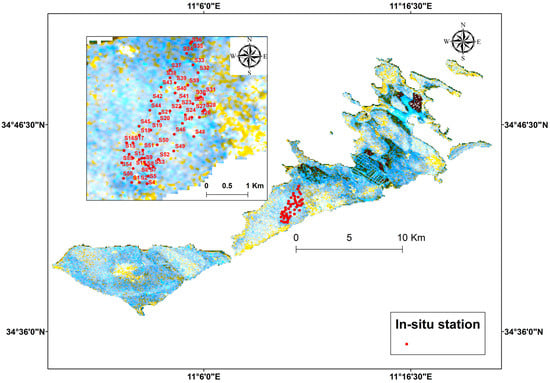 Figure 2 depicts an image captured by the Sentinel-1 satellite on 21 February 2023. The image showcases a color composite of backscatter values (σ0) derived from Sentinel-1 data, expressed in decibels (dB), originating from the Kerkennah archipelago. In this composition, distinct color channels are allocated as follows: red signifies VV polarization, green denotes VH polarization, and blue represents the VH/VV ratio. Notably, this image features a magnified perspective of a specific region, where on-ground measurements were executed on 20 and 21 February 2021. This targeted area is confined within a section of the Zorri Forest agricultural zone.