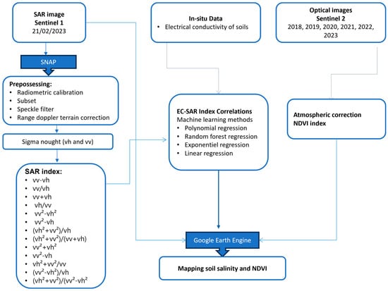 The final step involved interpreting the generated maps to discern spatial and temporal variations in salinity, effectively communicated through visualization methods that highlight changes in the agricultural landscape. Figure 3 summarizes the methodology applied in this study.