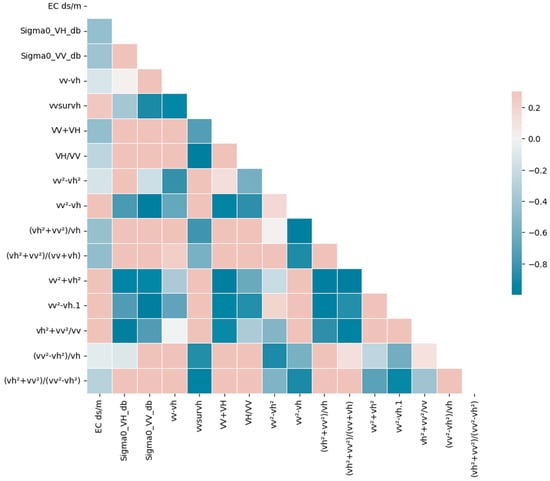 In total, thirteen SAR indices were computed based on the in situ electrical conductivity parameter. Then, these indices along with VV and VH were subjected to a thorough analysis to identify the most promising potential indicators. Subsequently, a correlation matrix was employed to assess and to determine the best correlated index with the EC values.