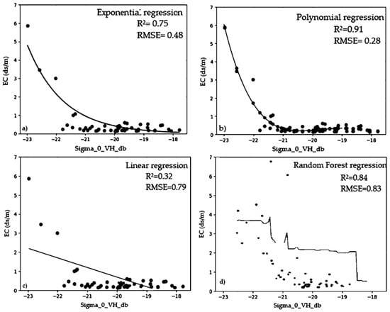 Different regression models were applied on Sentinel-1 data to generate the best reliable model for constructing soil salinity prediction maps in the Kerkennah region. Various regression models were used, like polynomial, random forest, linear regression, and exponential regression. Similar recent studies (2023) have highlighted the efficacy of various regression algorithms, like random forest with R2 = 0.80 [24] and the PLSR model with R2 = 0.66 [46], for predicting soil salinity in semi-arid and arid regions. Notably, in our study, the exponential regression model, due to its accurate fitting R2 = 0.75 and low root mean square error (RMSE) = 0.47 ds/m, was selected to predict soil salinity based on ground truth measurements and Sentinel-1 SAR data.