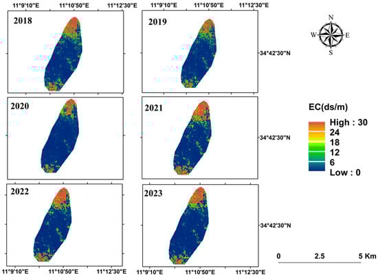Soil salinity prediction maps for the Kerkennah archipelago from 2018 to 2023.