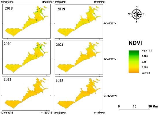 Upon initial observation, a notable trend emerges indicating a significant decrease in NDVI values over the entire time span from 2018 to 2023. In fact, areas with high NDVI values, ranging from 0.15 to 0.3, correspond to areas with high vegetation; however, areas with low NDVI values, ranging from 0 to 0.15, correspond to areas with low vegetation. This observation provides us with insight into a decline in the overall vegetation health of the islands’ vegetation.