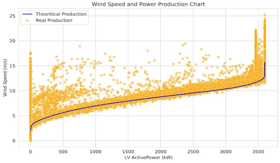 From Figure 5, we can see that the theoretical power production curve fits well with the real power production (LV Active Power (KW)). This figure also depicts that the wind speed reaches a maximum level and continues in a straight line if the power reaches 3500 KW.