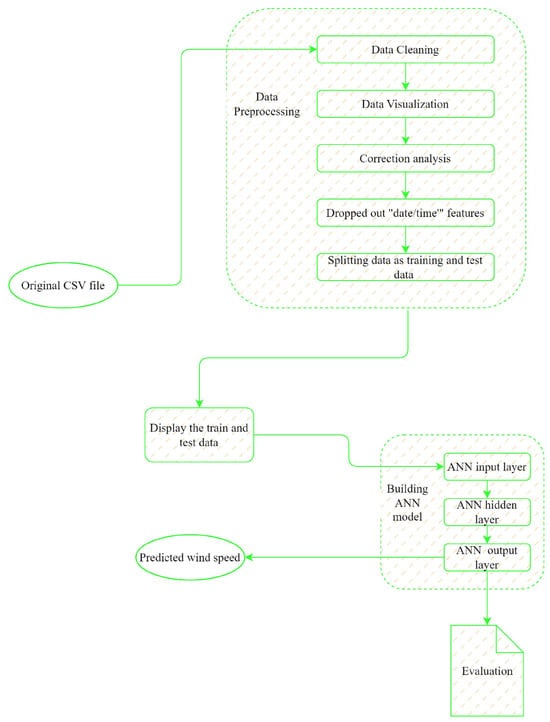 The suggested ANN-based model for predicting short-term wind speeds is shown in Figure 6 as an architectural diagram. A two-part primary model is presented here, with the first section focusing on data preparation and the second highlighting the development of the suggested model. After completing a number of tasks, such as data cleaning and removing extraneous characteristics from the data, the preprocessing portion divides test and train data. The data obtained is then entered into the model to provide the desired result of anticipating future values.