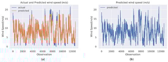 Table 3 shows that the ANN model has strong prediction outcomes and accuracy due to its low RMSE and high value as compare to other methods of study [44] which used random forest and study [45] which used neural network for prediction without optimization. This model uses adam optimizer function because of providing the highest performance or co-efficient of performance, and MSE and RMSE value among other optimizer functions. Figure 7. illustrates the training and test error that happens when the model is run on split data. According to this graph, the test error varies between epochs whereas the training error decreases as the number of epochs increases. The discrepancy between the actual and predicted wind speed is shown in Figure 8a based on the suggested short-term artificial neural network model. More than 12,000 data points of actual and anticipated values are presented for the simplification of Figure 8a. And Figure 8b highlights the predicted wind speed of over 25% of test data among the total data of the data-set. The maximum speed of wind exceeds more than 20 m/s and most wind speeds vary from 5 m/s to 15 m/s. When the performance of the suggested model is evaluated using real wind speed-based data, as shown in Figure 8a, the predicted value is noticeably closer to the actual value. Two estimated metrics, such as RMSE and , are regarded critical aspects in evaluating the model’s performance, where the RMSE value is substantially lower and is relatively high (from Table 3), indicating the best scenario among the other four points in the regression model. The ANN model utilized two hundred twenty-five neurons to mend short-term wind speed speculating. The findings support the hypothesis that the suggested method yields superior outcomes over alternatives.