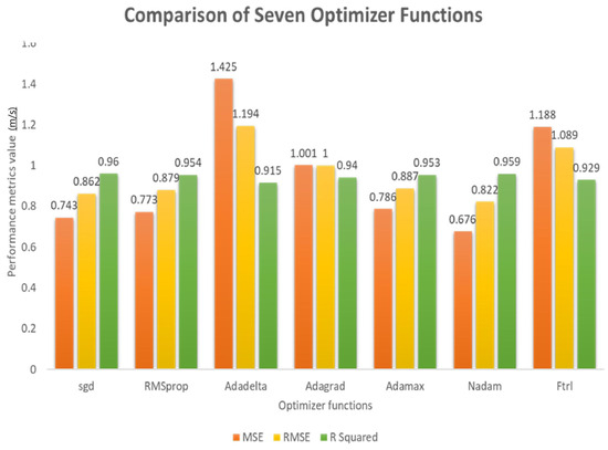 Figure 9 illustrates the comparison of different optimizers of our proposed ANN model. Suppose, the “Nadam” optimizer highlights the lowest difference between actual and anticipated values than other ones. However, “Adadelta” and “Ftrl” give the greatest discrepancy between the data-actual set’s and projected values. The performance of the model is good for the “sgd” optimizer and bad for the “Adadelta” optimizer as well due to having high and low values of in comparison to other functions.