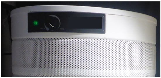 Using ventilation, indoor air purification, and personal protective equipment, such as masks and respirators, is an intervention recommended by the World Health Organization to reduce the spread of COVID-19 and other air-transmitted infections, such as tuberculosis []. In addition to air filtration systems that mechanically move air through filters and sorbents, air ionizers are increasingly used to remove particles from indoor air, and they have been shown to be especially practical for larger indoor spaces and highly effective at removing ultrafine and fine particles []. The ionizer generates ions through an electrical discharge and releases them into the indoor space. These ions attach themselves to air pollution particles in the air. The particles that acquire charge are attracted to each other and to surfaces in the indoor space, and so their removal from the air is enhanced. However, there is no mechanized airflow through the ionizers that would potentially deflect any sneeze or cough spray cone, so this type of indoor air purifier was not investigated in this study.