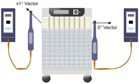 Two configurations of the outflow ducts or diffusers are available on the global market: the directional outflow configuration and the circumferential outflow configuration. The circumferential outflow diffuser does not vector the outflow vertically at a 90° angle or another defined angle to the horizontal plane. Circumferential outflow diffusers release the outflow in multiple directions at once. Therefore, there is a major difference between the circumferential outflow diffuser configuration and the other common indoor air purifier configuration, which has an air outlet on top of the indoor air purifiers and has been the subject of concerns [] regarding the potential for indoor air purifier outflow air currents to facilitate directional transport of airborne infectious particles indoors. The indoor air purifier used in the experiments was model C600 (Airpura Industries, Inc., Laval, QC, Canada) and did not include any ionizer or UV light source, so it did not produce ions or ozone. The air purifier was placed on the floor. The indoor air purifier has a circumferential diffuser with a height of 7 cm all around the perimeter of the air purifier. The indoor air purifier was operated at the lowest and highest speed of the blower. We measured the air velocity at 0° and 45° angles to the vector perpendicular to the surface of the outflow diffuser at ten distances between 0 cm and 100 cm using an air velocity meter, model 9515 VelociCalc (TSI Inc., Shoreview, MN, USA) (Figure 2).