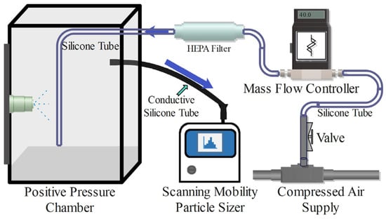Schematic of the positive-pressure chamber setup for the investigation of the size distribution of the aerosol generated by the sprayer. The component SMPS real-time aerosol sizer and the metered clean air delivery system are shown.