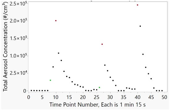 Total concentration in the chamber during three activations of the sprayer. The green data points correspond to the first observed aerosol particle concentration increase after each activation of the sprayer. The red data points correspond to the peak aerosol particle concentration after each activation of the sprayer.