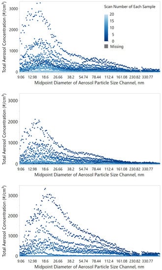 A wide size distribution was measured in the aerosol generated by the sprayer (Figure 4); it was reproducible. The mode diameter of the aerosol size distribution was around 15–18 nm and remained around this size as the aerosol aged over half an hour. At the same time, the concentration of aerosol particles in the chamber gradually decreased. The color gradient from dark blue to light blue represents the time scale from sprayer activation to near-zero total concentration over about 30 min; each of the three graphs shows data for one of the three consecutive sprayer activation events (Figure 5).
