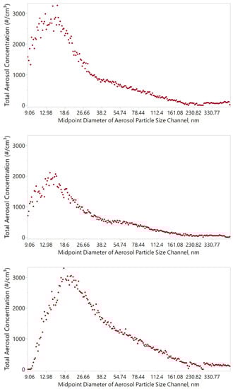 Following three consecutive activations of the sprayer, the total concentration of aerosol particles reached 1.5 × 105–2.5 × 105 cm−3 (Figure 4). The gradual decay of the total aerosol particle concentration following three aerosol particle concentration spikes in the test chamber showed a return to baseline levels close to zero after 15 min following each of the three spray activation events.