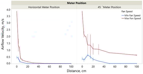 In the case of the minimum blower speed, the drop in airflow velocity with increasing distance from the outflow diffuser was rapid at both the 0° and the 45° angles. At the maximum blower speed, the difference between the 0° and 45° angles was more pronounced. At a 0° angle with the blower at the maximum speed, the drop in airflow velocity was rapid and reached airflow velocities like those at the minimum blower speed, already around 50 cm from the diffuser. At 45°, the drop in airflow velocity was rapid, with distancing from 0 cm to 20 cm from the outflow diffuser. After 20 cm, the rate of decrease of the airflow velocity at 45° slowed down, dropping from 1.08 ± 0.40 m/s to 0.63 ± 0.04 m/s.