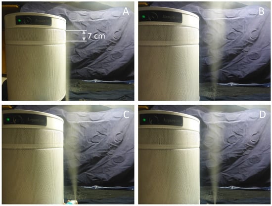 Photographs of the mist cone parallel to the side of the indoor air purifier. (A,B) Air purifier operating at the lowest blower speed. (C,D) Air purifier operating at the highest blower speed.
