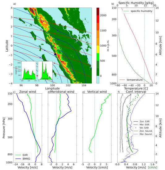 Atmospheric soundings data from Padang (WMO ID: WIMG, operated by Meteorology, Climatology and Geophysical Agency BMKG, 100.35° E, 0.88° S) for 2001–2019 were used to obtain the mean thermodynamic structure as well as horizontal winds throughout the troposphere near EAR location. Soundings launched at 00 UTC were utilized. Although this dataset does not provide any insight into subdiurnal variability, horizontal wind measurements were used for comparison with EAR data. Processed atmospheric sounding data, in their final form available through Global Telecommunication System, were downloaded from the University of Wyoming website. All available profiles for the extended boreal winter were used to calculate the mean vertical structure of temperature, humidity (Figure 1b), and horizontal winds (Figure 1c,d).