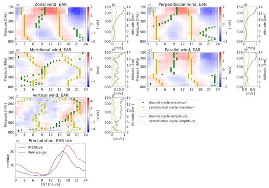 Figure 2 illustrates the mean diurnal evolution of wind components and precipitation at the EAR location. Wind data are obtained from EAR, while precipitation data come from IMERGv6 and a rain gauge operated at the EAR location. A composite diurnal cycle is analyzed, decomposing it into diurnal and semidiurnal modes (Equation (1)). The amplitudes of both modes for horizontal wind components are approximately equal in the lower and middle troposphere (not shown). However, these amplitudes (less than 1 m/s) are generally one order of magnitude lower than the daily mean values, leading to robust variations on a diurnal time scale without significantly altering wind direction at specific altitudes. EAR observations align with the theoretical calculations [28], showing that the dominating semidiurnal mode during boreal winter occurs at 3 and 15 LST for zonal wind and at 6 and 18 LST for meridional wind (Figure 2a,e).