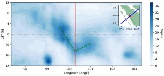 Mean diurnal evolution of precipitation along the line passing through EAR site and perpendicular to the Barisan Mountain range (shown on the panel in the top-right corner). Data from IMERGv6. Each horizontal line shows mean data along the investigated line. Red line indicates the longitude of EAR site. Green lines show the inland and offshore propagation patterns.