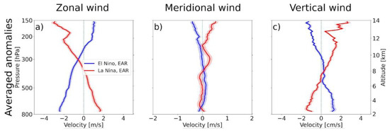Tropospheric wind variability near EAR location as a function of ENSO phase, EAR data. Mean anomalies of zonal (a), meridional (b), and vertical (c) wind profiles are shown. The red lines indicate the profiles for El Niño phase composites. Similarly, the blue lines correspond to the La Niña phase composites. Shadings indicate standard errors.