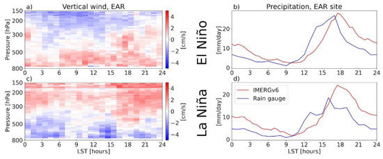 Diurnal evolution of vertical wind anomalies and precipitation. Top row corresponds to El Niño composites; bottom row represent the results for La Niña events. Panels (a,c) show composite diurnal variability in vertical wind’s anomalies (EAR data). Panels (b,d) represent composite of rainfall over EAR site: blue lines—rain gauge, red lines—IMERGv6 data for nearest grid point.