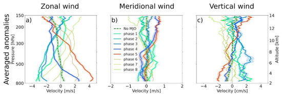 Profiles of the averaged zonal wind anomalies (Figure 7a) change from phase to phase, as expected for the MJO structure and its eastward propagation [14,65,66]. In the lower troposphere (below 500 hPa), the typical westerly flow vanishes or even reverses during RMM phases 1–3. The strongest upper-level westerly anomaly is observed in phases 7 and 8. The magnitude of variations in the lower troposphere is larger than in the upper troposphere, which indicates the bottom-heavy structure of MJO in EAR observations. Moreover, the changes in the middle and upper troposphere are delayed with respect to the lower troposphere, e.g., in the lower troposphere, the transition from easterly anomalies to westerly anomalies occurs between phases 3 and 4, while in the middle troposphere, it is observed between phases 4 and 5. It is consistent with a westward tilt in the MJO structure.
