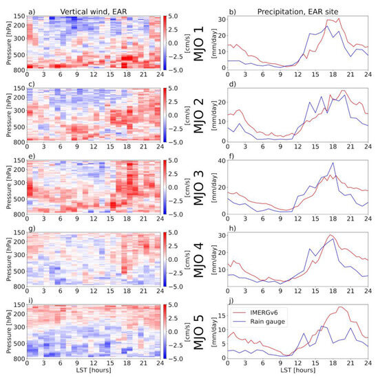 Mean diurnal cycle of vertical wind and precipitation for MJO RMM phases—each row corresponds to results for specific phase. Panels in left column (a,c,e,g,i) present composite diurnal evolution of vertical wind from EAR data. Panels in right column (b,d,f,h,j) show composite IMERGv6 and rain gauge data for corresponding days.