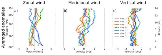 A significant evolution of tropospheric winds is observed within ±2 days of CCKW passage over the EAR location (Figure 9), consistent with precipitation variability due to CCKW activity [20]. The evolution of a zonal wind anomalies during a CCKW passage over the EAR site is consistent with the westward-tilted baroclinic structure of a CCKW [17].