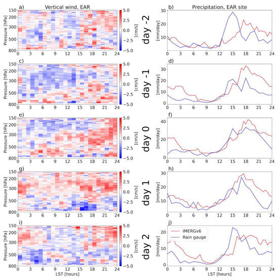 Mean diurnal cycle of vertical wind and precipitation during CCKW activity—each row corresponds to the results for specific day related to CCKW passage. Panels in left column (a,c,e,g,i) present composite diurnal evolution of vertical wind from EAR data for days from 2 before (day −2) to 2 after (2) CCKW passage. Panels in right column (b,d,f,h,j) show composite IMERGv6 and rain gauge data for corresponding days.