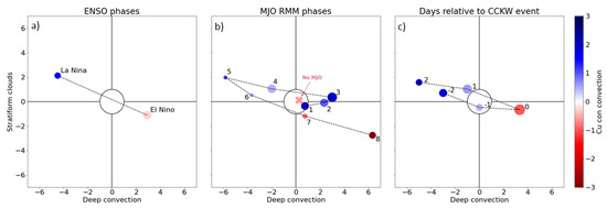 Differences in cloud population during large-scale events over Sumatra. X-axis shows normalized contribution from deep convective clouds, Y-axis shows normalized contribution from stratiform clouds and colors of a marker shows normalized contribution from cumulus congestus clouds. Normalization is based on a standard deviation of typical vertical wind variability calculated using vertical wind anomalies for 45 composites, each based on 50 random days, to which clouds contributions have been calculated. The size of the dot is related to the anomalies of precipitation from ORG in EAR location. Panels show variability associated with (a) ENSO phases, (b) MJO activity, and (c) CCKW events.