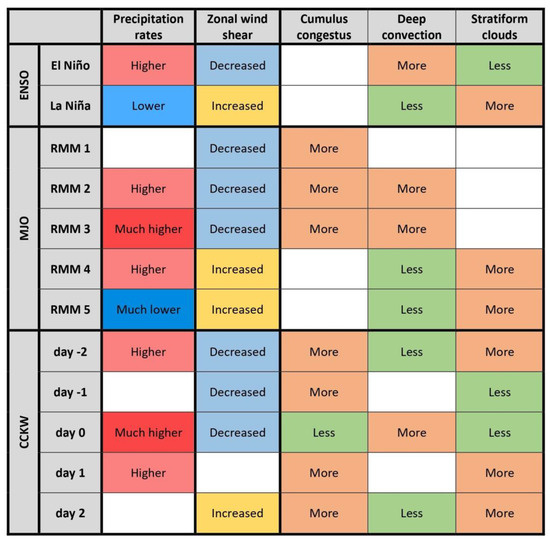 Moreover, the average daily anomalies of vertical wind for specific events may be used for the analysis of variations in cloud populations based on the relationship between the latent heating profiles of clouds and associated vertical winds (as described in Section 2). These results are summarized in Figure 11. EAR data indicate an increased amount of deep convective clouds and decreased amount of stratiform clouds and (slightly) decreased amount of cumulus congestus clouds during El Niño. The opposite occurs during La Niña—more stratiform clouds, more cumulus congestus, and less deep convective clouds. The evolution of vertical wind profiles during MJO may also be linked to the robust variability in cloud population. While phases 1–3 are characterized by increasing amounts of deep convective clouds, during phases 4–6, a significant decrease in the contribution of these clouds to a cloud population is observed. This can be related to the convective ‘center’ of an MJO envelope moving east of West Sumatra during and after phase 4. Between phases 6 and 8 of MJO, a significant increase in deep convective clouds and a decrease in stratiform and cumulus congestus clouds are observed. It is consistent with a convection-forming ‘hot tower’, rather than aggregating to mesoscale clusters [70]. During CCKW activity, an inferred cloud population also show robust variability. Two days before a CCKW event, a decreased amount of deep convective clouds, accompanied by an increased amount of cumulus congestus and stratiform clouds is noticed. The cloud population changes significantly over the next two days and is dominated by deep convective clouds on the day of CCKW passage. Two days following the passage of the CCKW’s convective center, cloud population mimic behavior was observed over two days before it (−3 days and +3 days relative to CCKW passage show cloud populations similar to typical conditions, not shown). Therefore, immediately before and after a CCKW event, the cloud population is similar but its diurnal progression differs significantly, which exemplifies coupling between clouds and circulation. All of the abovementioned impacts of large-scale atmospheric phenomena on the weather over the investigated area are summarized in Figure 12.