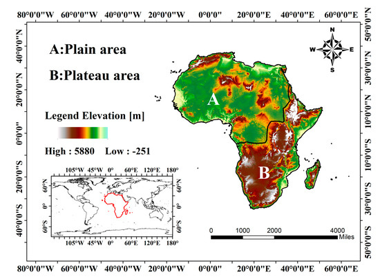 Figure 1 shows the landform of Africa. Africa is a continent spanning the equator, located between the northern and southern hemispheres. It is surrounded by the Atlantic and Indian Oceans, and the Mediterranean Sea [36]. Its total area is 30,370,000 km2 [32]. The African population is unevenly distributed; the southern and eastern regions are relatively densely populated, while most of the areas north of the Sahara are more sparsely populated [37]. The African coastline is extremely long, and the southern and eastern coastlines are more rugged, while the northern and western coastlines are flatter. Southern and eastern Africa are dominated by mountains and plateaus, while the western and northern parts are dominated by deserts and plateaus (Sahara Desert and Atlas Mountains) [38]. Southern Africa has wet summers and dry winters, while the northern and western regions are dominated by desert landscapes. The average temperature in southern Africa is usually between 20 and 30 °C. The climate in northern Africa is milder along the Mediterranean coast, where the annual average temperature is about 20–22 °C. The climate is hotter in desert regions, and the maximum temperature in summer can reach about 50 °C. Due to the geographical location of Africa, its climate types are diverse, including savanna, tropical desert, and tropical rainforest climates [39,40,41].