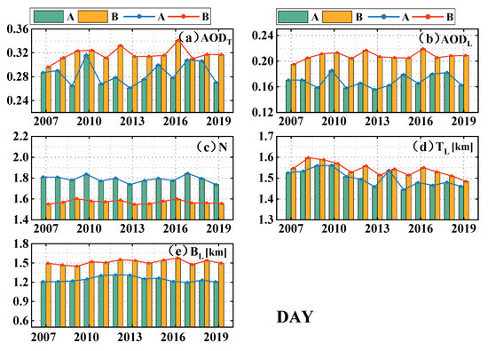 Interannual variation in the optical properties of African aerosol layers during daytime from 2007 to 2019. (a) AODT, (b) AODL, (c) N, (d) TL, (e) BL (A: plains area; B: highland area).