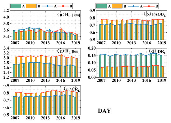 Interannual variation in the optical properties of African aerosol layers during daytime from 2007 to 2019. (a) HH, (b) PAODL, (c) HL, (d) DRL, (e) CRL (A: plains area; B: highland area).