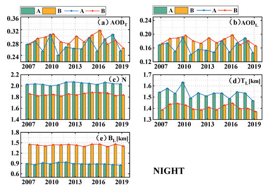 Interannual variation in the optical properties of African aerosol layers during nighttime from 2007 to 2019. (a) AODT, (b) AODL, (c) N, (d) TL, (e) BL (A: plains area; B: highland area).