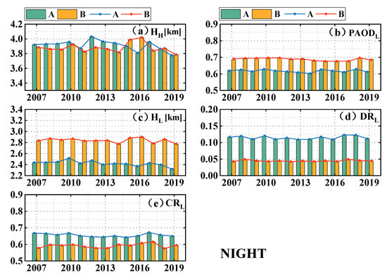 Interannual variation in the optical properties of African aerosol layers during nighttime from 2007 to 2019. (a) HH, (b) PAODL, (c) HL, (d) DRL, (e) CRL (A: plains area; B: highland area).