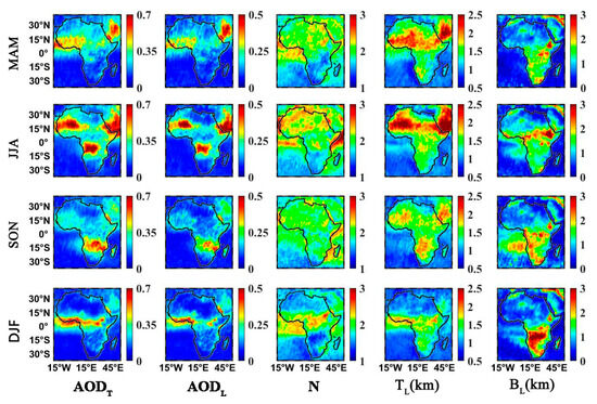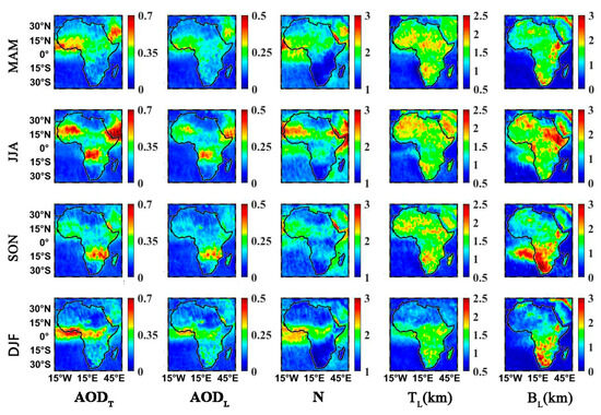 Seasonal spatial distribution of AODT, AODL, N, TL, and BL over Africa during daytime.