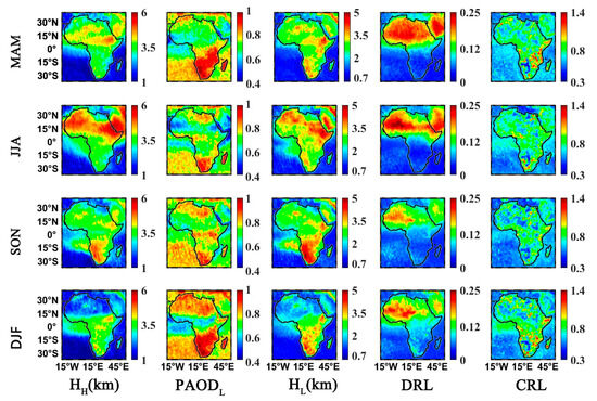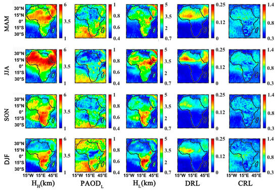 Seasonal spatial distribution of HH, PAODL, HL, DRL, and CRL over Africa during daytime.
