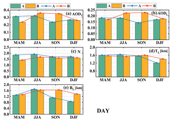Seasonal variation in the optical properties of the aerosol layer over Africa during daytime from 2007 to 2019. (a) AODT, (b) AODL, (c) N, (d) TL, and (e) BL (A: plains area; B: highland area).