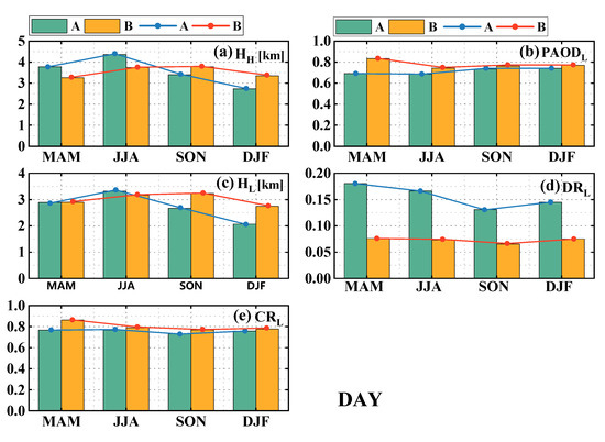 Seasonal variation in the optical properties of the aerosol layer over Africa during daytime from 2007 to 2019. (a) HH, (b) PAODL, (c) HL, (d) DRL, and (e) CRL (A: plains area; B: highland area).