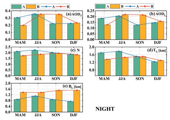Seasonal variation in the optical properties of the aerosol layer over Africa at night from 2007 to 2019. (a) AODT, (b) AODL, (c) N, (d) TL, and (e) BL (A: plains area; B: highland area).